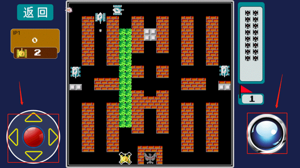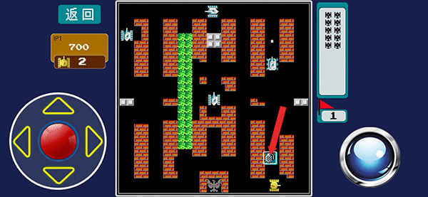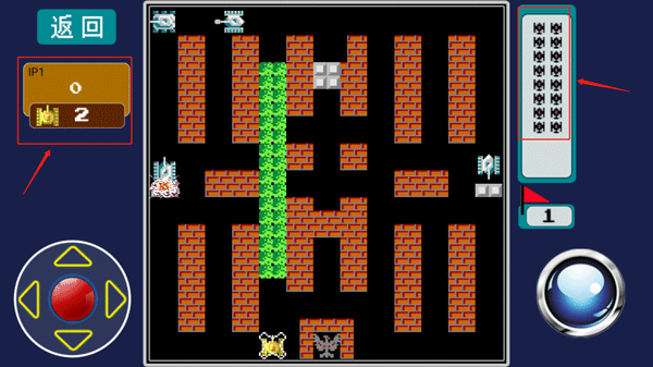 地图中敌坦不断涌现,你的任务是守护巢穴中央的雄鹰不被击毁,同时逐一歼灭所有来犯之敌。己方剩余生命数显示于屏幕左侧,敌方残存战力则以白色数字框呈现于右上角,每击毁一辆敌坦,对应数字即时递减