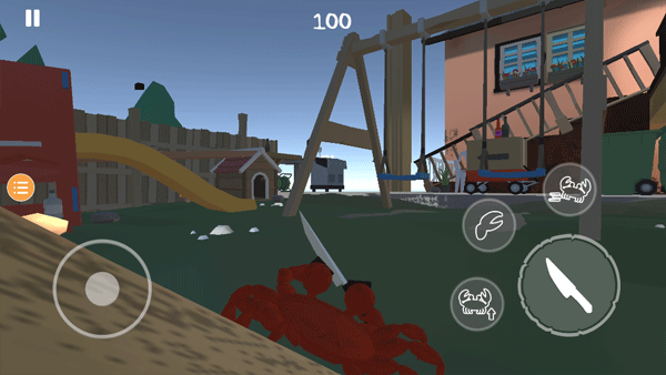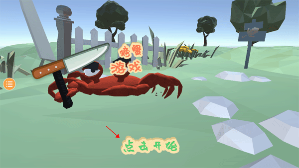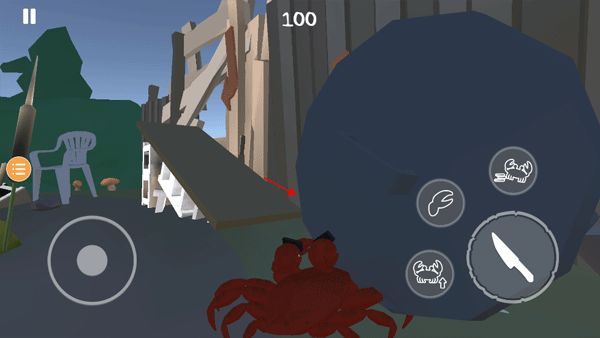 初始阶段,螃蟹位于小池塘中,通过左侧虚拟方向键控制移动,右侧向上的箭头用于跳跃,拾取的小刀可用来攻击敌人。