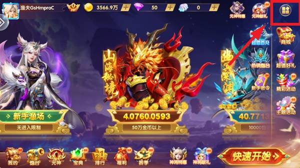 1. 启动《捕鱼神手》游戏,在主界面右上角找到并点击由四个方块组成的按钮。