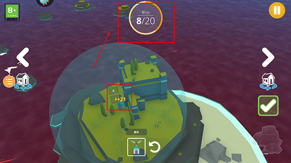 通过建造指定类型与数量的建筑获取分数,完成阶段目标方可解锁后续区域;