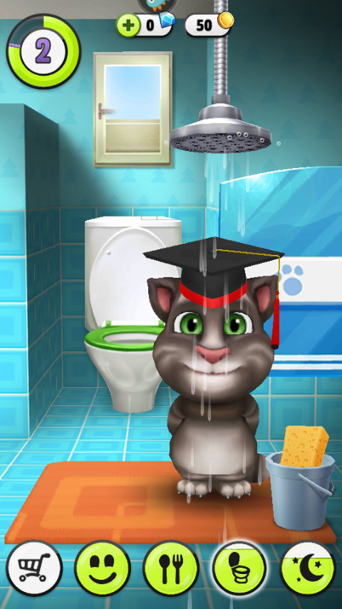 切换到浴室场景,先用海绵蘸水在汤姆猫身上打圈揉搓,待泡沫丰盈后拉动花洒开关,温水淋下,它会甩头抖水、舒服地原地转圈。