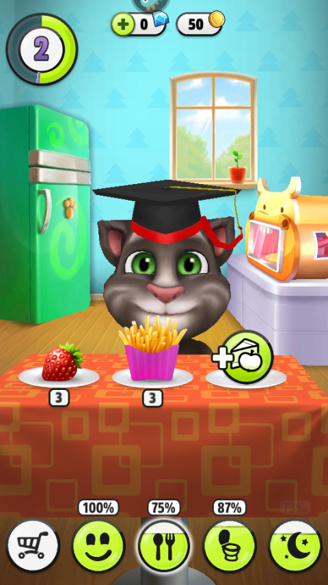 点击界面下方叉形图标进入厨房区域,将食物直接拖至汤姆猫嘴边喂食;也可点击烤箱图标,把生食加工成香喷喷的熟食,猫咪进食后幸福度明显上升。