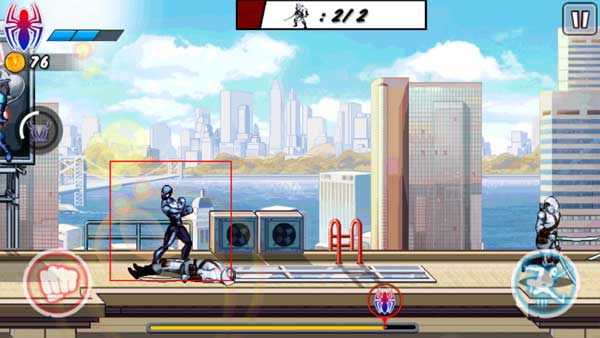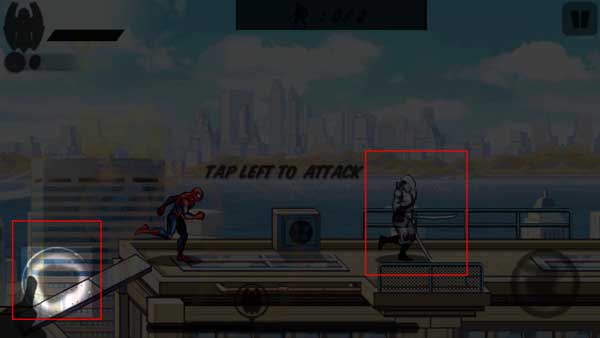 操作逻辑紧贴蜘蛛侠本能反应——向上滑跃过断桥,向下滑闪避激光网,左右滑切入窄道或绕行巨型机械臂,战斗按键触发蛛网缠绕、墙面蹬踏反击等连招。