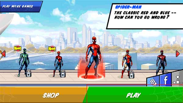 进入游戏后直接滑动选择心仪蜘蛛侠形象,确认后点击“PLAY”即刻启程。