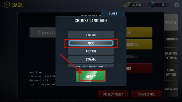 在语言列表中选择【中文】,确认后点击“APPLY”,系统将自动切换为简体中文界面。