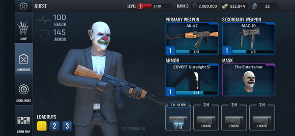 角色形象可深度自定义,面具、服装、防弹背心、手持道具等元素均支持解锁与混搭,无论是冷峻特工、街头悍匪还是伪装身份的行动者,都能通过外观细节强化角色代入感,配合高清建模与流畅动作表现,营造身临其境的犯罪行动氛围。