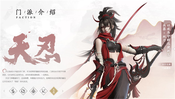 天忍源于战火废墟,承萨满遗风,习实战杀技。门中功法不尚花巧,专求迅疾狠准,出手即见生死。双刀在手,近身如影随形,劈砍挑刺皆含爆裂之势,暴击频发,攻势凌厉,令对手未及反应已陷险境,是江湖中最不可轻忽的暗夜锋刃。