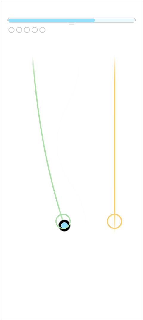 音符不是垂直坠落,而是被音乐本身牵引着游动。两条端点构成的线条在平面上起伏、旋转、折叠,带动中间轨迹产生有机律动,点与线因此拥有了重量与方向。这种动态谱面让每一次下落都不可预判,却又处处呼应节拍本质。