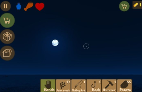 斧头用于砍伐椰子树或拆除冗余木筏单元,合成需四块木板、五块废铁与一根绳子;鱼竿无需饵料,浮标下沉瞬间点击即可收线,三块木板加两根绳子即可制成;建造锤是扩展结构的核心工具,五块木板与两块废铁构成其骨架;钩子开局即赠,后续可重制,三块废铁加两根绳子完成;长矛既是防御武器也是肉食来源,四块木板、两根绳子与四块废铁组合而成,每次击中鲨鱼均掉落鲨鱼肉。