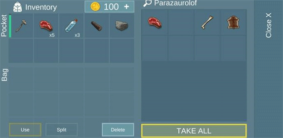 点击背包左侧按钮,可查看当前持有的全部资源,合理管理物资有助于提升生存效率。