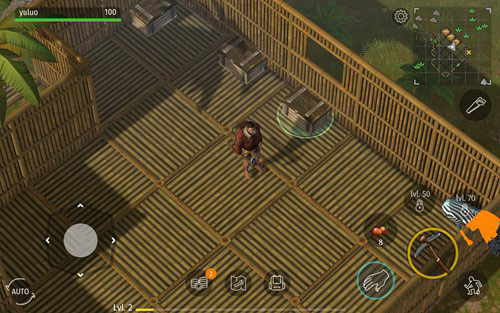 房屋建成后,可专注于资源收集与工具制作。点击底部中间按钮打开制作界面,优先制作斧头、石镐或长枪等基础工具,用于采集或狩猎。达到2级后,解锁木箱与背包,极大扩展存储能力。