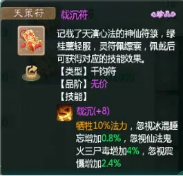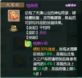 枯荣符以+8为例,牺牲速度换取忽视控制0.8%,并按自身原有属性提升6.4%的忽视仙法、鬼火、三尸、毒、震慑效果,但存在上限限制。法伤上限12.8,震慑上限6.4。综合来看,敏系角色牺牲速度得不偿失,血量偏低的女性角色亦难从中获益,不如选择载沉符更为实际。