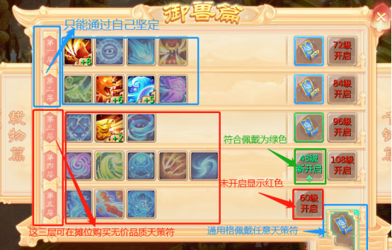 天策符界面中,符合佩戴条件的格子显示为绿色,不符合则为红色。天演策共设五层,第一、二层仅能通过自行鉴定获得对应符文;第三至第五层可通过摊位购买无价天策符进行装配,通用格可自由搭配任意层数符文。