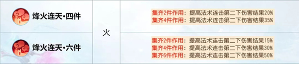 烽火连天套装仅对法连第二段伤害生效,而该段基础伤害约为正常法伤的一半。因此,最适合拥有法连特性的门派,如龙宫,以实现稳定增益。