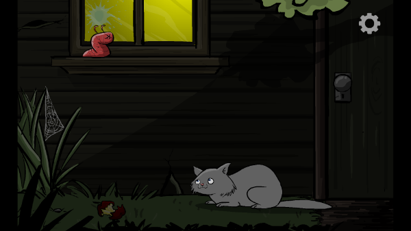 第二关:点击门把手引来猫,再点蛛网和烂苹果,虫子会吐出浆液吓走猫;再次点猫使其返回,接着点门上方的树影进入洞穴;快速点击四个按钮后退出,点猫致其死亡,最后点门把手完成关卡。