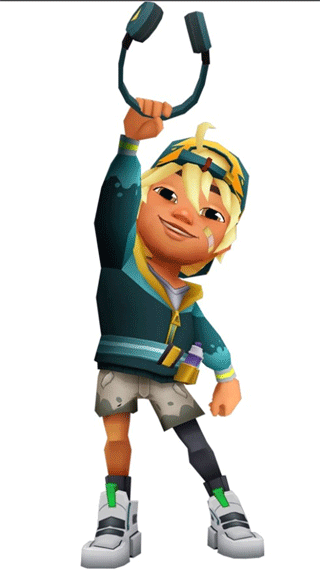 他肤色白皙,淡褐色双眸透着灵动,凌乱金发下是一顶镶有金色装饰的绿松石色帽子。上身叠穿水绿色与金色拼接夹克及白色T恤,下着浅棕短裤,点缀灰色斑点。腰间系浅蓝腰带,挂载多个喷雾罐。左腿着长袜,右腿为短袜,脚踩白底黑带绿舌运动鞋。灰色耳机与脸颊上的创可贴细节,进一步强化其叛逆又真实的街头形象。