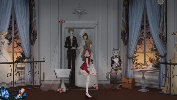 进入神秘房间后,首先在第一把椅子背面取得一把伞,人偶手中另有一把,再前往衣柜旁窗台拉开窗帘,可找到第三把伞及一个水桶。将三把伞放入入口处的筐中,其颜色组合即为书桌上盒子的密码。打开盒子获得抽屉钥匙,用其开启抽屉,内有锤子与针线套装。墙上的面具可拼合,用途暂不明确。在伞筐附近移动红发娃娃,下方藏有剪刀。点击床上枕头,取出一块手帕,用剪刀裁剪后以针线缝制成裙子。触碰花瓶拾取白玫瑰,用锤子砸碎茶几上的红酒瓶,将白玫瑰染红,与白裙搭配。随后在茶几右侧椅子下方发现穿红裙的玩偶,与其互动触发捉迷藏任务,将红裙交给玩偶后获得衣柜钥匙。进入衣柜稍作停留后返回,房门即被破坏,完成该区域解谜。