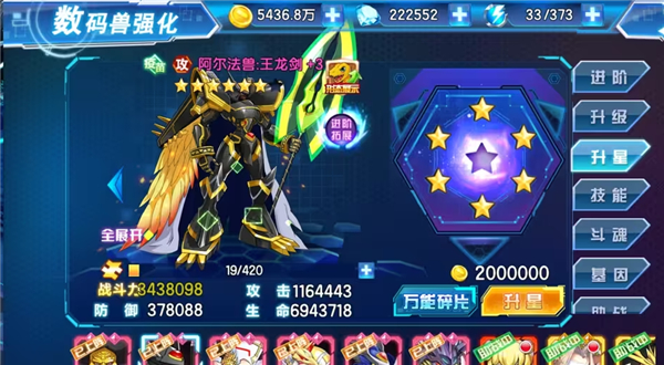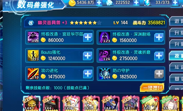 技能等级对特定数码兽影响深远。被动或核心主动技能建议优先投入资源升至130级甚至满级144级,尤其是第五、第六技能,单次升级可带来数百战力提升。非核心技能则可视情况维持在100级左右,合理分配金币避免过度消耗。